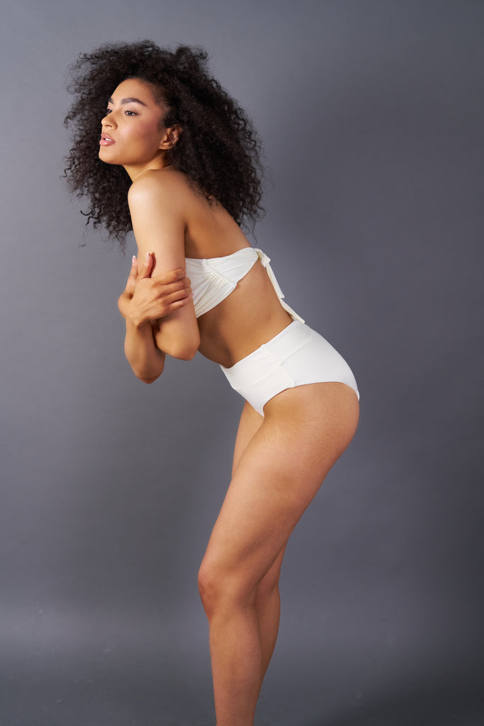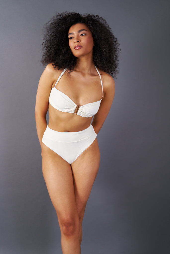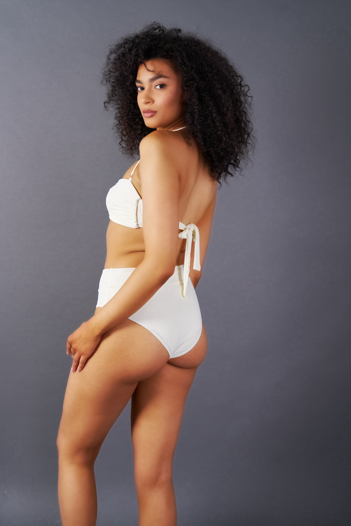 Introducing our newest Tropezienne set, designed for ultimate comfort and style on your beach adventures. This set features a bandeau top and high rise bottoms, crafted from our softest fabric to ensure you look and feel your best by the water.